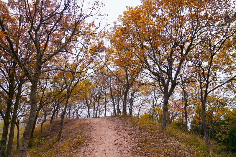 景观特色:进入深秋,长梁子徒步道沿线的树木褪去浓绿,换上橙红、金黄的盛装。风一吹,树叶飘落,在步道上形成天然的“地毯”。