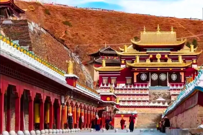 木雅大寺布局开阔,雪山、草地、藏式建筑、白塔群同框出现,还有身着红衣的僧人匆匆而过,宛如一幅美丽的画卷。