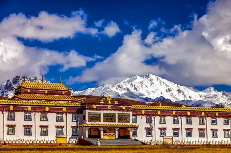 木雅大寺,海拔3600米,与雅拉雪山和雅姆雪山相映成趣,绘就一幅雪山、草地、藏式建筑和谐共生的画卷。